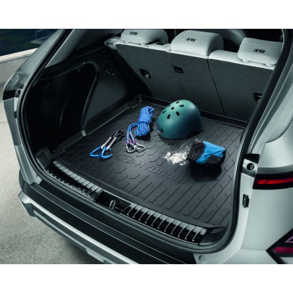 Hyundai Kona gyári csomagtértálca, méretpontos, tökéletesen illeszkedő. Gyári, kopásálló, szagtalan gumiból készült peremes gumi csomagtartó tálca Hyundai Kona autókhoz.