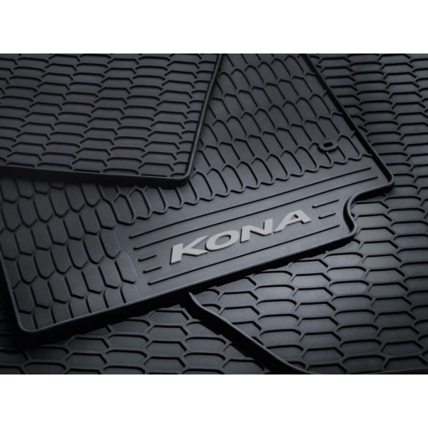 Hyundai Kona gyári gumiszőnyeg, méretpontos, tökéletesen illeszkedő, a vezető oldalon a gyári pontokra a padlóhoz rögzíthető, Kona logóval ellátott gumiszőnyeg. A Hyundai minden időjárás esetén használható gumiszőnyegei ideális védelmet nyújtanak a jármű lábtere számára.