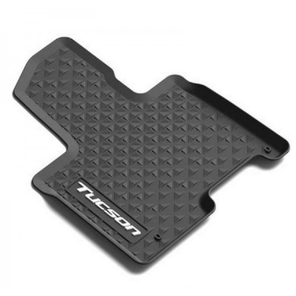 Hyundai Tucson gyári gumiszőnyeg, méretpontos, tökéletesen illeszkedő, a vezető oldalon a gyári pontokra a padlóhoz rögzíthető, Tucson logóval ellátott gumiszőnyeg. A Hyundai minden időjárás esetén használható gumiszőnyegei ideális védelmet nyújtanak a jármű lábtere számára.